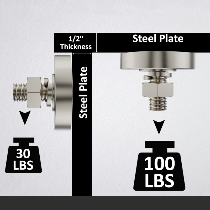 Equipped with an integrated m8 male thread and a generous 20mm thread length. This design allows for easy installation by putting the magnet through a hole and fastening it with a nut, making powerful mounting magnets compatible with hardware assemblies and metal brackets of varying thicknesses..