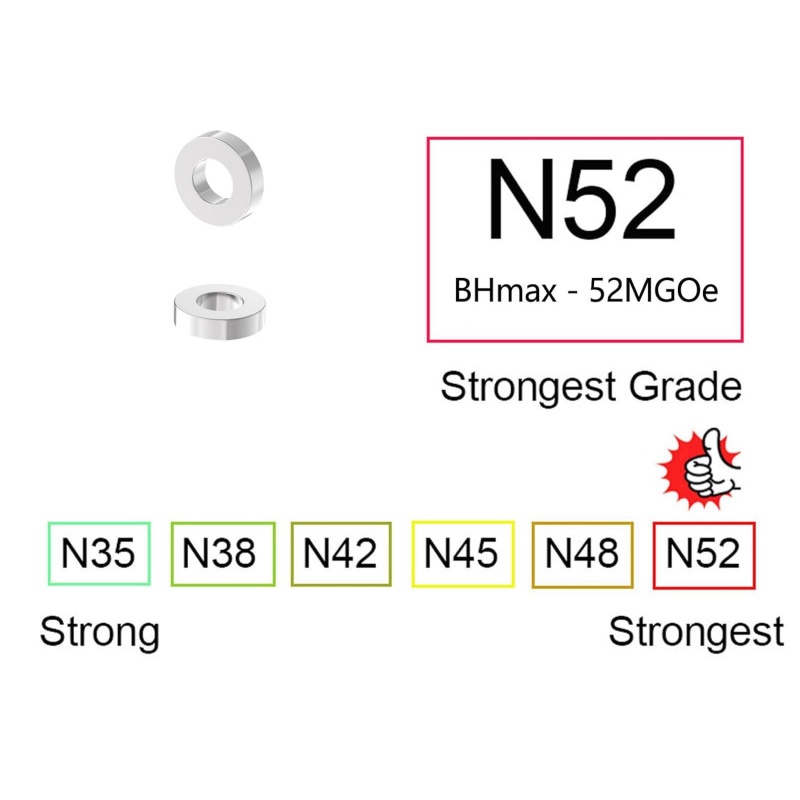 Magnete der Güteklasse N52 Sie bieten im Vergleich zu niedrigeren Güteklassen eine außergewöhnliche Haltekraft. Ihre Magnetkraft ist etwa 20 % stärker als die von N42 und über 50 % stärker als die von N35, wodurch sie sich ideal für Anwendungen eignen, die maximale Magnetkraft bei kompakter Bauweise erfordern.