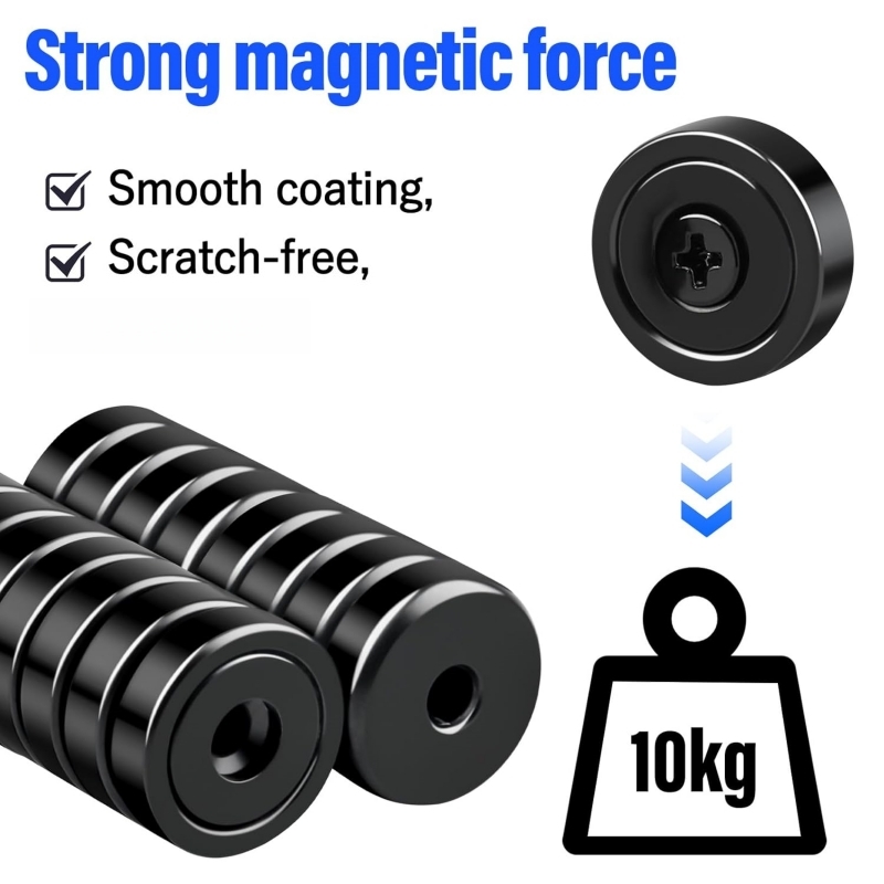 Schwarzer runder Neodym-Tassenmagnet Es findet breite Anwendung in mechanischen Anlagen, Werkzeugvorrichtungen, Metallrahmen und industriellen Anzeigesystemen. Besonders geeignet ist es für Anwendungen, die eine präzise Schraubenpositionierung und eine langfristig stabile Fixierung in komplexen oder anspruchsvollen Umgebungen erfordern.