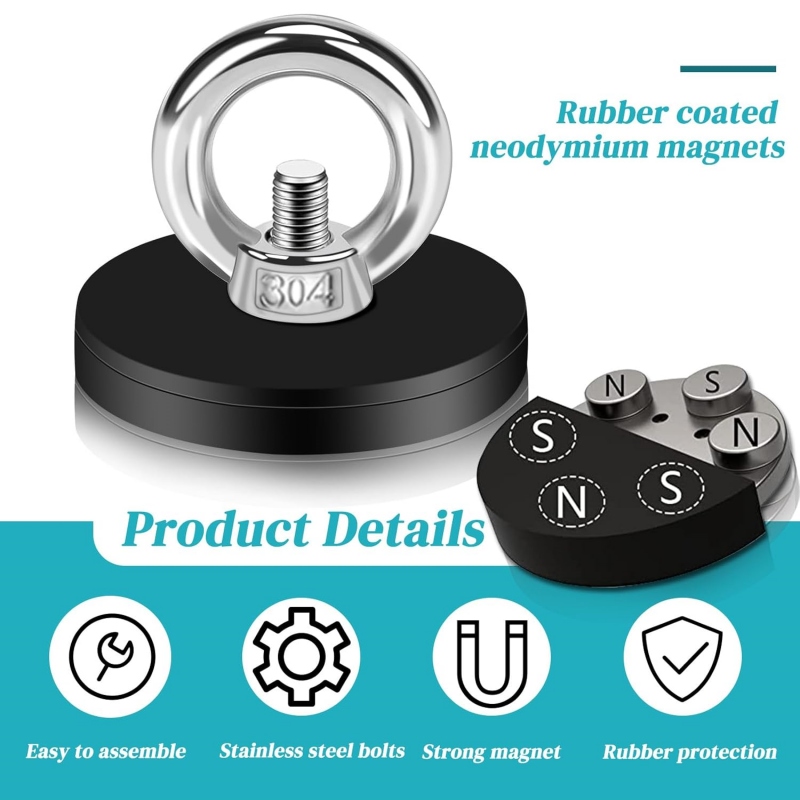 Insgesamt Angelmagnete mit weicher Gummibeschichtung, mit Außengewinde und einem Edelstahlring mit Gewindebuchse, sind für sicheres Heben und Positionieren auf Metalloberflächen konzipiert und bieten eine stabile Haltekraft, Oberflächenschutz und Rutschfestigkeit.
